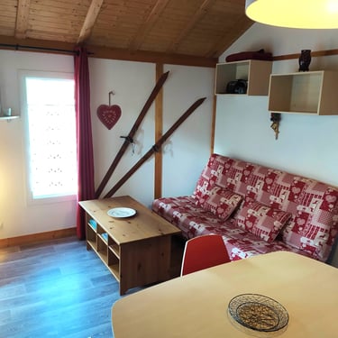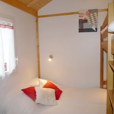 Spécificité du chalet "montagne" : la 2e chambre est équipée d'un canapé clic-clac offrant 2 couchages et d'un lit mezzanine 1 place