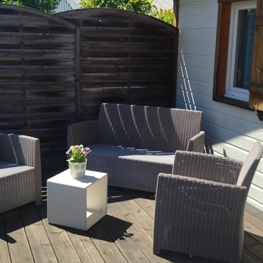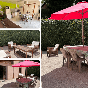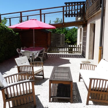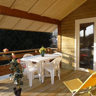 terrasse couverte partiellement avec salon de jardin et coin repos...