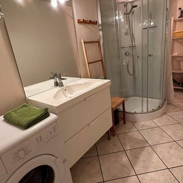 salle d'eau avec douche, meuble sous vasque et lave-linge