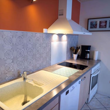 Cuisine équipée : frigo-congélateur, four micro-ondes combiné, tout le nécessaire pour cuisiner (plats, casseroles...), robot ménager, grille pain, cafetière, huile, vinaigre, sel, poivre...
